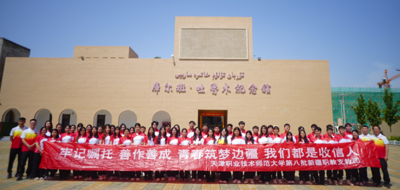6月2日,来自和田职业技术学院、于田县中等职业学校、策勒县中等职业学校、民丰县职业技术学校的天津职业技术师范大学第八批新疆职教支教团55名师生前往库尔班·吐鲁木纪念馆和于田县博物馆参观学习。