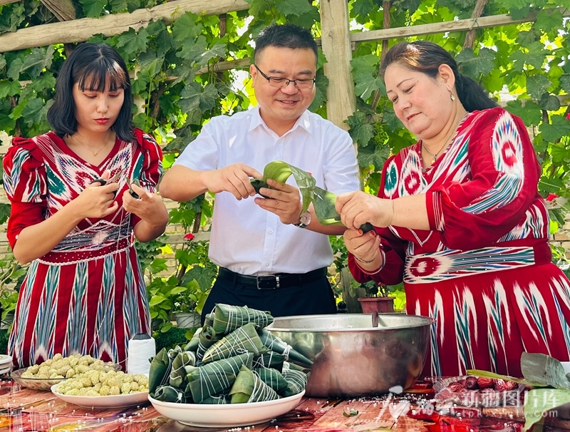 金华市援疆指挥部援疆干部前往结对亲戚家里,与亲戚一家共度端午节(2023年6月18日摄)。