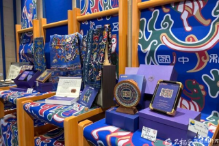 自治区博物馆展示的“五星出东方利中国”锦护臂的文创产品。石榴云/新疆日报记者 玛依古丽・艾依提哈孜摄
