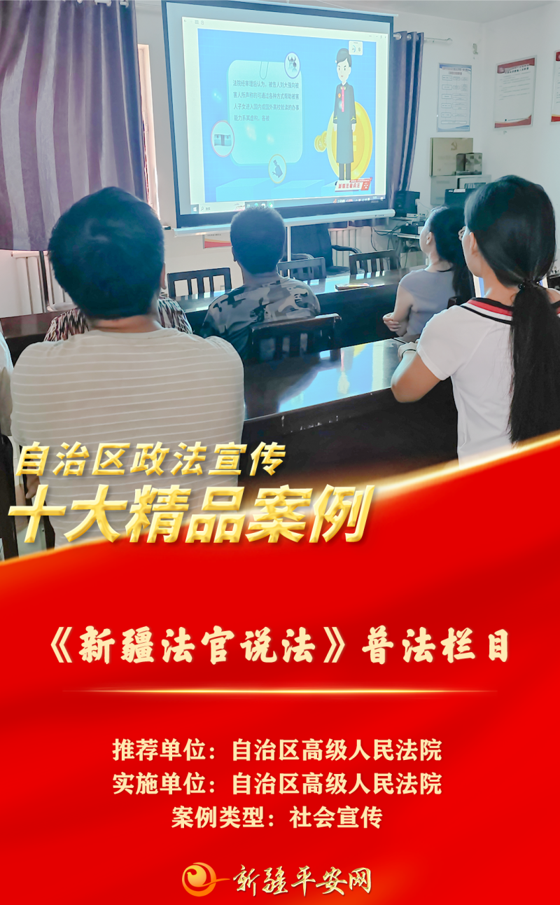 自治区高级人民法院制作了原创普法栏目《新疆法官说法》。该栏目选取已审结案件,由法院干警自编、自导、自演,结合动漫、网络视频、热播影视等素材进行制作,内容经严格审核把关后播出。该栏目以百姓普遍关注的视角,采用通俗易懂的语言释法析理,现已推出《高空抛物谁担责》《打印遗嘱有效吗》等116期说法节目,在央视频、石榴云、中国法院网等平台持续更新,受到高度关注和一致好评。今年,在自治区党委宣传部的大力支持下,《新疆法官说法》已在机场、地铁、BRT、社区、商超大屏、部分机关楼宇电视循环播放,遍布乌鲁木齐大街小巷,成为自治区高院普法品牌栏目。