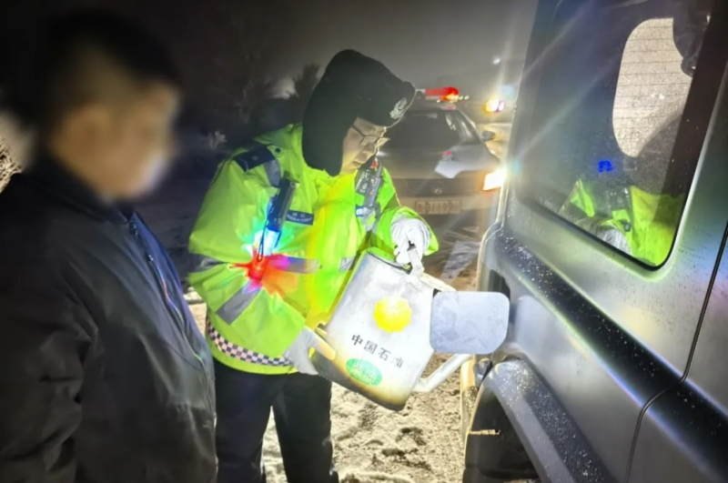 12月8日,奇台县公安局交警大队民警为燃油耗尽的车辆加油。受访单位供图