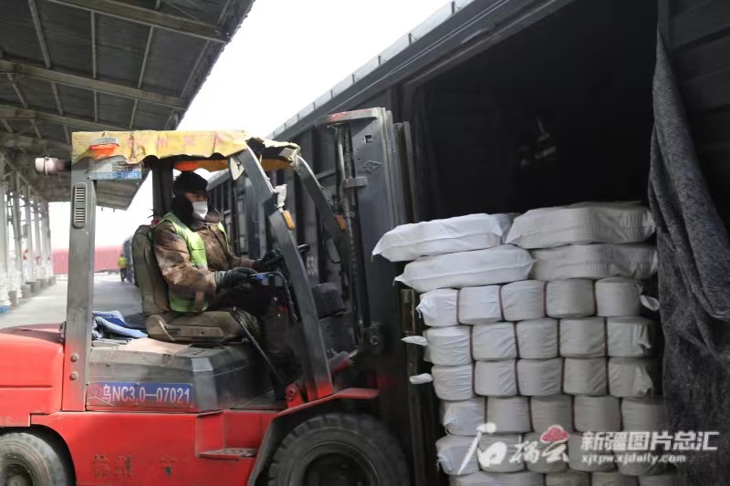 在喀什货运中心货场内,装卸人员正在进行棉纱装车作业。李慧媛 吴奇摄