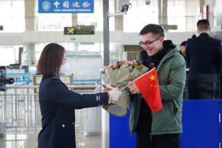 2月23日,巴克图边检站民警为首位入境旅客赠送鲜花。刘慧慧 摄