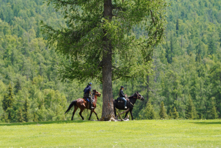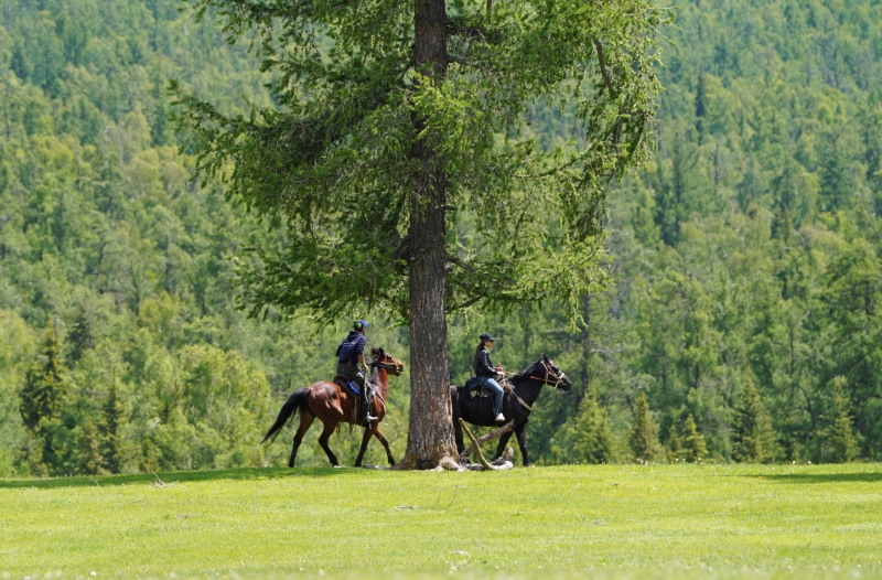 在新疆阿勒泰地区哈巴河县,游客在骑马。新华社记者 阿曼摄