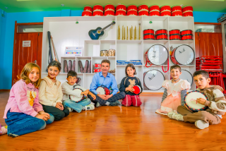 仙迪·米兰夏与学生们在学校的音乐教室中。图/受访者提供