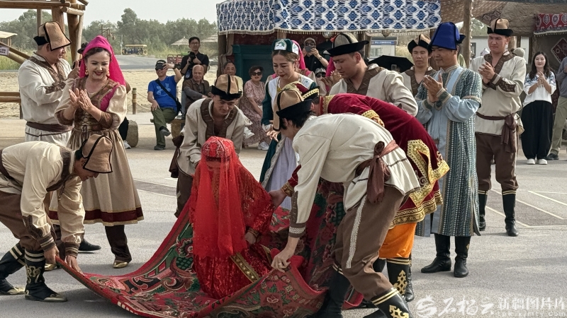 9月14日,罗布人村寨景区的“丝路巴扎”洋溢着喜庆气氛,演员们正在演绎罗布人婚俗。石榴云/新疆日报记者 拍热扎提·阿不都 摄
