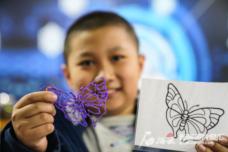 2月23日下午,乌鲁木齐市天山区新时代文明实践中心,9岁的丁杰鹏展示自己用3D打印制作的“蝴蝶”。石榴云/新疆日报记者 王琦铭摄