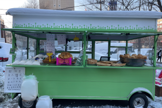 一个绿皮白顶的四轮电动售卖车上,摆放着芝麻馕、辣皮子馕、苞谷馕和一袋袋牛奶。旁边贴着一张微信二维码,下边挂着一个白色板子,上面写着:“好消息,无人馕店,买一个五元,买三个十元,牛奶一公斤五元,自己拿自己付款。”12月8日,在“无人馕摊”前,记者看到,不断有路过的人好奇地驻足观看,也有人自己取馕,用塑料袋装好,然后扫码付款。