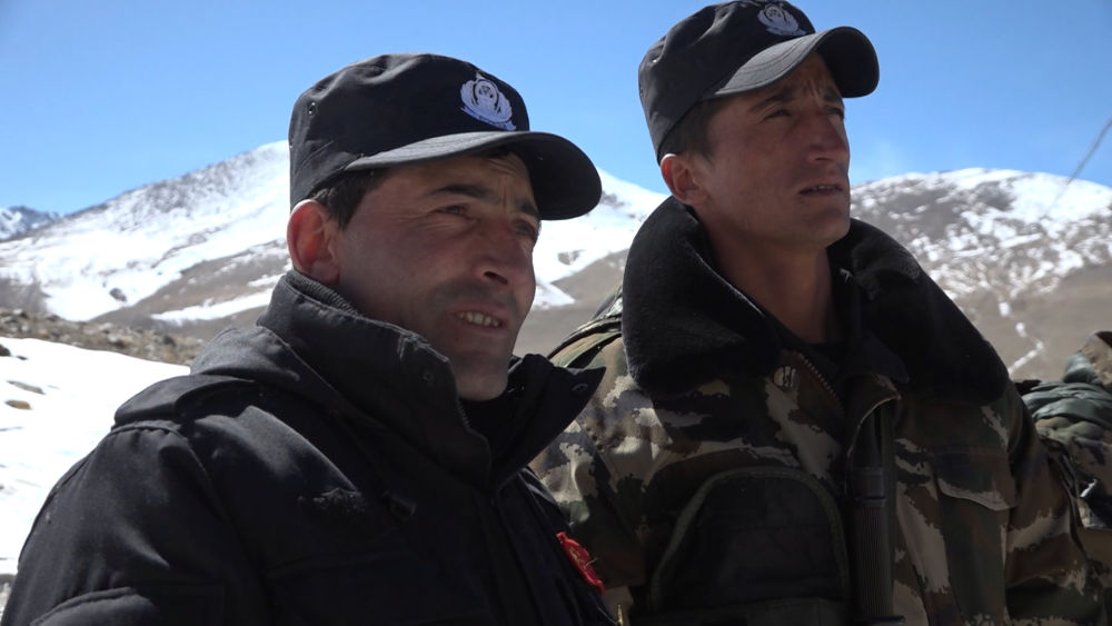 在新疆红其拉甫边境线上,拉齐尼·巴依卡(左)和护边员在巡逻途中。(视频资料截图)