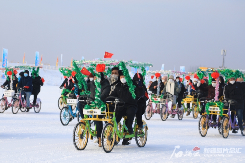 1月1日,游客在博斯腾湖大河口景区体验冰上项目。胡侍琦摄