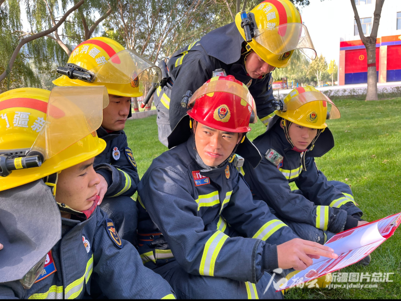 全国人大代表、阿克苏地区消防救援支队库车市长宁路消防救援站政治指导员李运飞带领消防救援人员一起学习。受访者供图