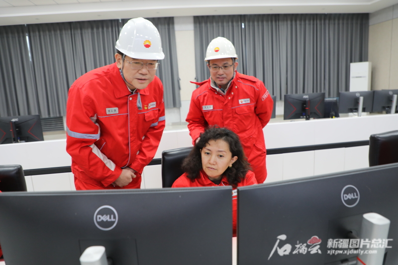 2月16日,全国人大代表、中国石油新疆油田分公司党委书记、执行董事杨立强(左一)在新疆油田采油二厂81号联合站调研。新疆油田供图