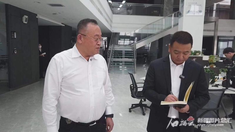 全国政协委员、新疆君邦投资有限公司董事长刘伟(右)在企业调研。本人供图