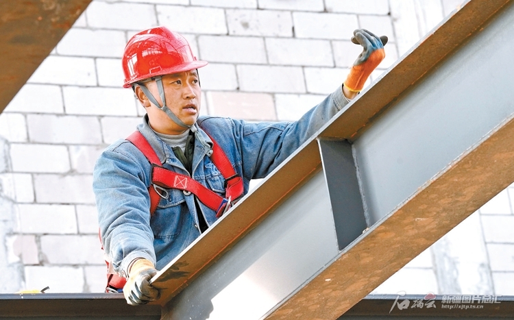 3月2日,工人在维吾尔药生产基地进行外立面钢架安装作业。位于乌鲁木齐高新技术产业开发区(新市区)的新疆维吾尔药业有限责任公司年产1亿盒维吾尔药生产基地项目预计今年底竣工投产。石榴云/新疆日报记者邹懿摄