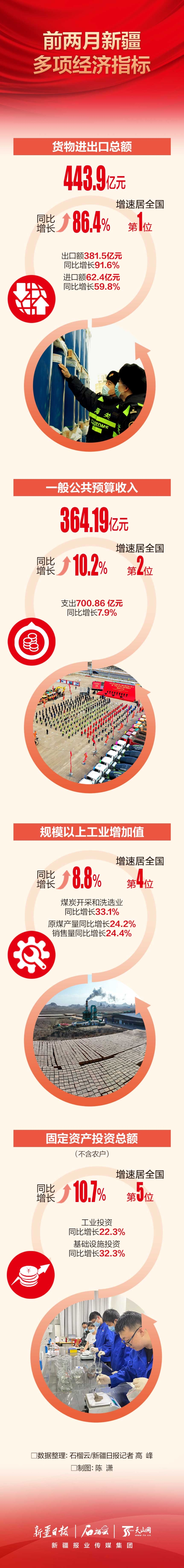 石榴云/新疆日报讯(记者 高峰报道)货物进出口总额同比增速居全国第1位,一般公共预算收入同比增速居全国第2位,规模以上工业增加值同比增速居全国第4位,固定资产投资总额同比增速居全国第5位……3月17日,自治区统计局发布今年1—2月新疆经济运行简况,多项经济指标增速居全国前列。