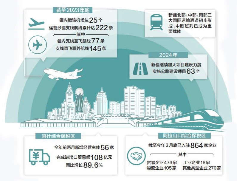 抓住历史机遇,新疆加大基础设施建设力度。新疆北部、中部、南部三大国际运输通道初步形成,中欧班列已成为与各国深化经贸合作的重要载体,进出境、进出疆、南北疆之间交通更加便利。