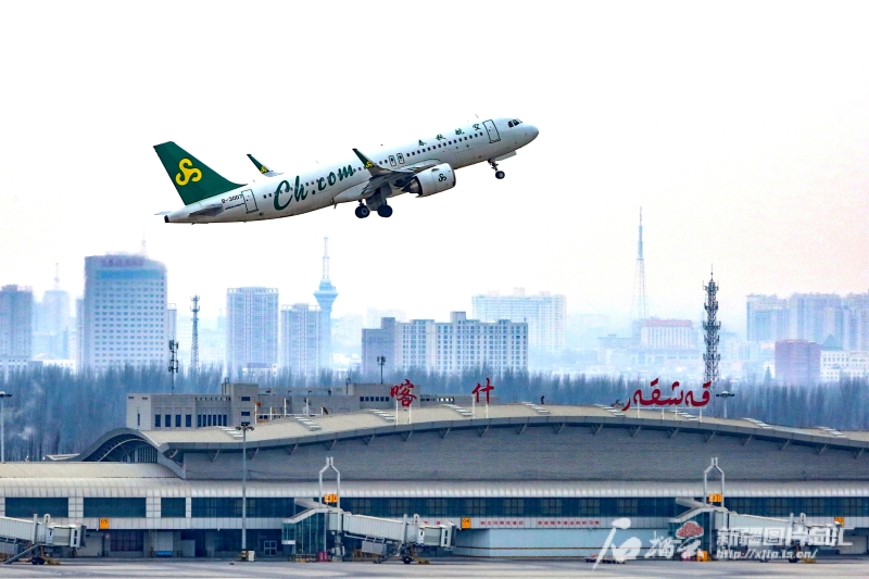 2月6日,一架客机从喀什徕宁国际机场起飞。新疆机场(集团)有限责任公司供图