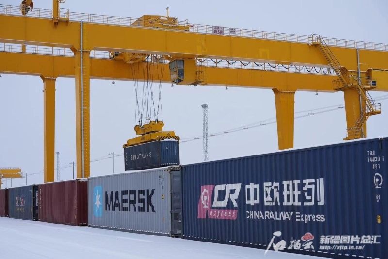 近千里外的乌鲁木齐国际陆港区内,声声汽笛划破长空,中欧(中亚)“天山号”班列向西而行。