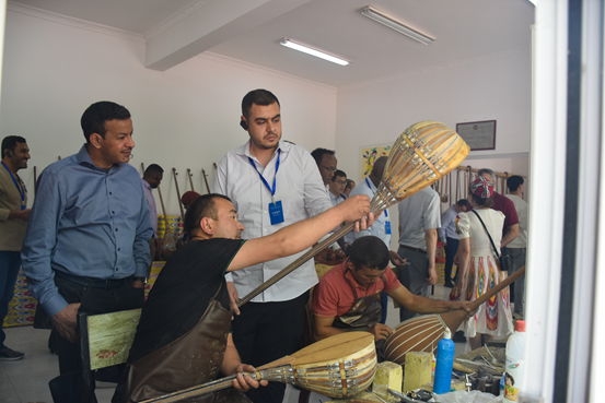 2023年5月31日,阿拉伯国家联盟代表团一行在喀什中国新疆民族乐器村景区内参观传统乐器制作过程。(高晗 摄)