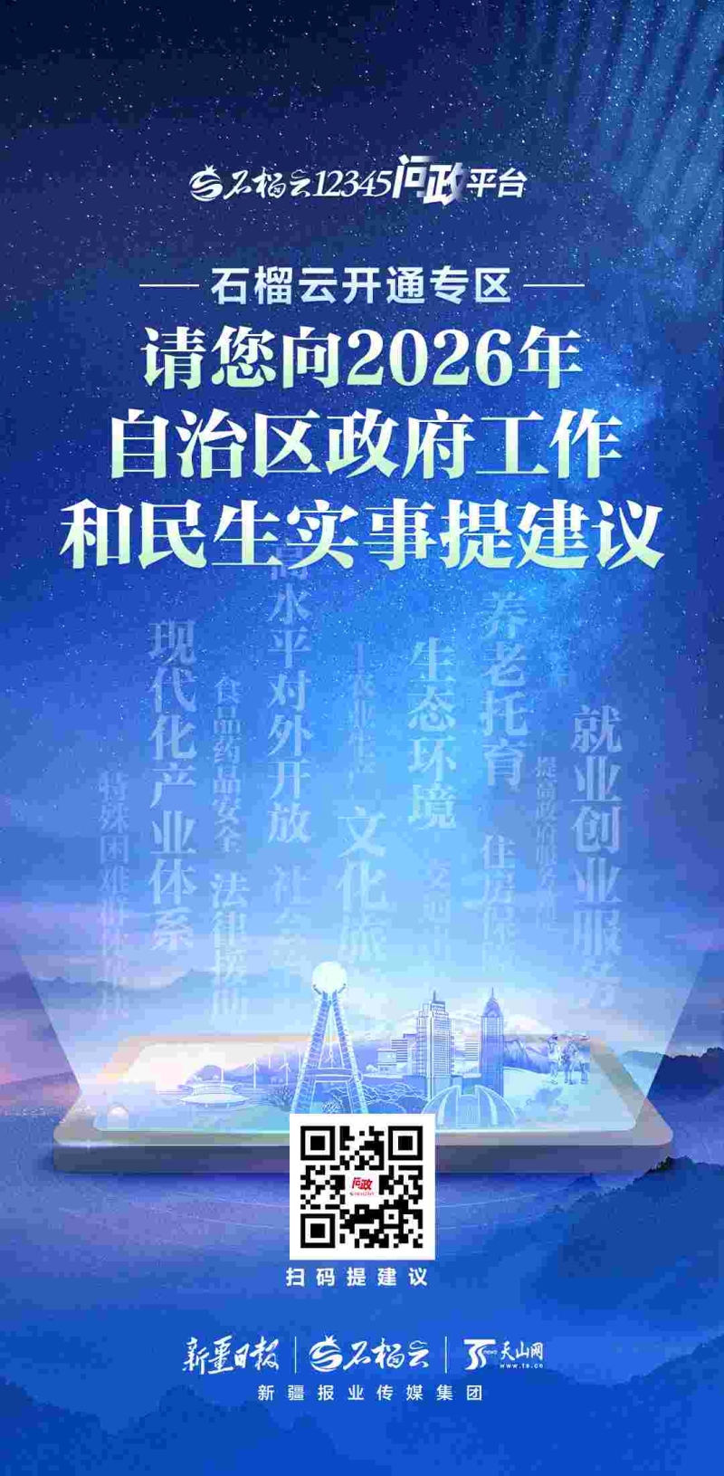 石榴云/新疆日报讯(记者 费璇报道)即日起,石榴云12345问政平台开通专区,请您向2026年自治区政府工作和民生实事提建议,欢迎广大网友建言献策。