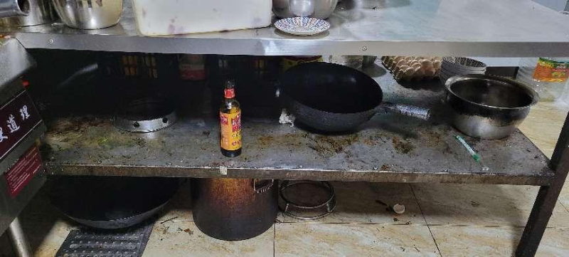 上榜理由:烹饪台物品摆放混乱,后厨不整洁;东西摆放杂乱。油烟机油污未定期清理。